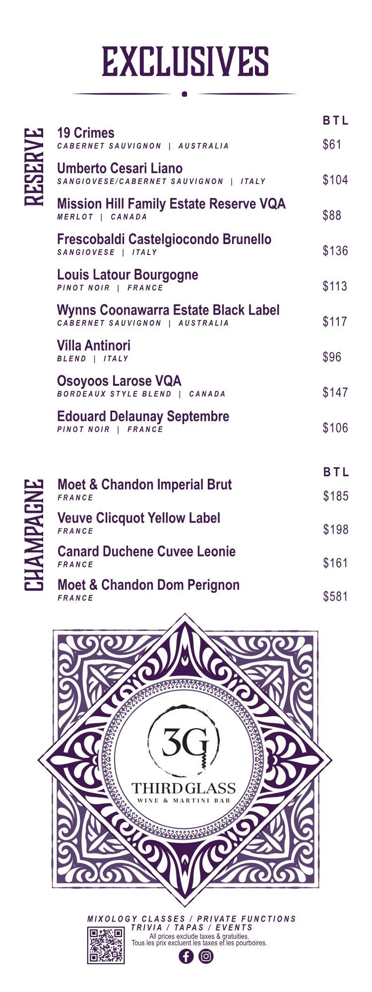 Inspiration derived from the finest and most trendy wine bars in the world. Featuring the largest wine by the glass selection in Atlantic Canada. Including an array of exquisite cocktails and unique martinis, come escape and discover The Third Glass